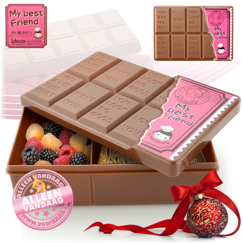 Tijdens de feestdagen, eet en snoep je vaak meer dan in welke andere maand dan ook. Maar wat nou als je iets lekkers hebt om naar te kijken, zonder dat het mogelijk is om ervan aan te komen?! Deze broodtrommel zorgt daarvoor! Word je alsnog vanzelf helemaal blij als het weer tijd is voor je dagelijkse lunch, zonder dat je jezelf op allerlei lekkers hoeft te trakteren. Stop je lunch dus in dit vrolijk trommeltje, dat maakt het voor jou (én je omgeving) een stuk leuker! Dit bruine chocolat lunchboxje heeft de vorm van een flinke chocoladereep en staat vol opvrolijkende teksten. Wat dacht je van 'You are the best' bij je boterham? Of 'You look so good' tijdens je appel? Juist, dat wordt puur genieten! Genieten van chocolade, terwijl je iets gezonds nuttigt... Wie had dat gedacht?!