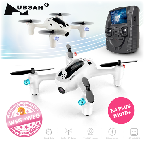 Dames (en heren), opgelet! Vandaag scoor je een hele vette deal voor de beste prijs van Nederland. Deze Hubsan X4 H107D+ quadcopter is een mini-drone voorzien van ingebouwde 720p HD camera. Dankzij deze camera kun je niet alleen video-opnames maken in HD-beeldkwaliteit, maar via het 4.3 inch display op de bijgeleverde afstandsbediening kun je de camerabeelden live bekijken. Met behulp van deze Hubsan X4 H107D+ camera drone heb jij een extra set ogen en kun jij letterlijk overal kijken. Niet zo maar een model, maar de X4-serie van Hubsan is één van de meeste populaire serie mini-drones ter wereld. Alleen vandaag voor een bodemprijs. Veel vliegplezier en tot morgen, piloten!