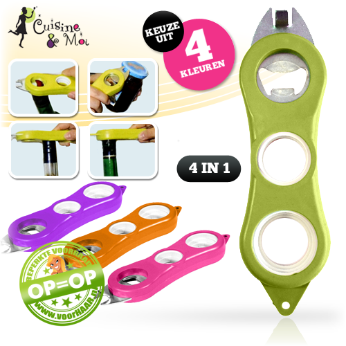 Als er een plek is in huis waar men het liefst een paar handigheidjes heeft liggen, is het wel in de keuken. Deze kunnen er namelijk voor zorgen dat alles nét wat gemakkelijker wordt en je werk als keukenprinses wordt versoepeld. Dit is een klassiek voorbeeld van een voltreffer op dat gebied. Met dit groene, paarse, roze of oranje keukenhulpje haal je namelijk een 4 in 1 opener in huis. Met deze opener open je flesjes, draaidoppen van 26, 28 en 32 mm en potjes met deksels. Voor de prijs hoef je het niet te laten, dus kies je kleur en koop gauw! Geen geworstel meer met het openen van potten een flesjes, geweldig!