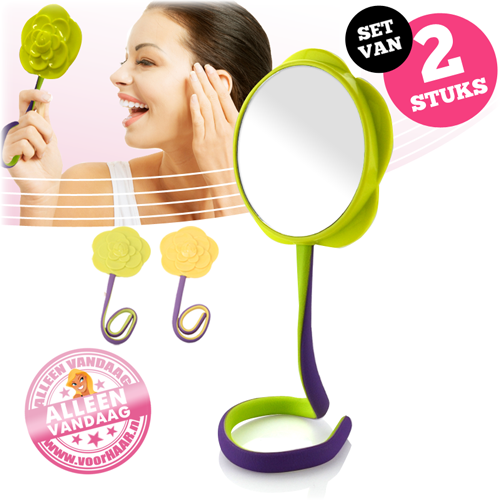 Spiegeltje spiegeltje in je hand, wie is de mooiste van het land? Inderdaad, niet aan de wand. Dit spiegeltje is namelijk heel gemakkelijk vast te maken aan allerlei andere dingen dan aan de wand. Dit doe je door de buigbare steel van deze schattige bloem. Deze kun je zo draaien dat de spiegel gewoon blijft staan, of je draait de stengel ergens omheen, zodat je spiegel op een bepaalde hoogte hangt. De vrolijke bloemvorm van de spiegel zorgt ervoor dat deze spiegel nooit n de weg hangt, maar juist een leuke toevoeging is aan je slaapkamer of badkamer. Ga er dus gauw voor, want je krijgt vandaag 2 stuks per bestelling en de deal is maar tot 23.59 uur vanavond geldig!