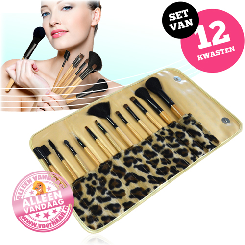 Onderzoek heeft uitgewezen dat de vrouw gemiddeld maar liefst 79 minuten voor de spiegel staat! En dan te bedenken dat dat een gemiddelde is, dus dat er ook mensen bij moeten zitten die er nog véél langer voor staan. Het blijkt dat het dus wat tijd en moeite mag kosten. Daar mag je dan ook wel wat degelijk gereedschap bij gebruiken. Met de set van vandaag ben je wat betreft het aanbrengen van je make-up in een keer klaar. De set bestaat namelijk uit 12 verschillende kwasten en brushes. Groot, klein, dik en dun: het zit er allemaal in! En hetgeen waar het inzit, daar wordt ook elke vrouw van binnen gelukkig van. Het overzichtelijke etuitje met panterprint houdt niet alleen alles netjes op zijn plaats, maar heeft ook nog eens een beschermende functie voor je gerei. Beter kun je niet wensen!